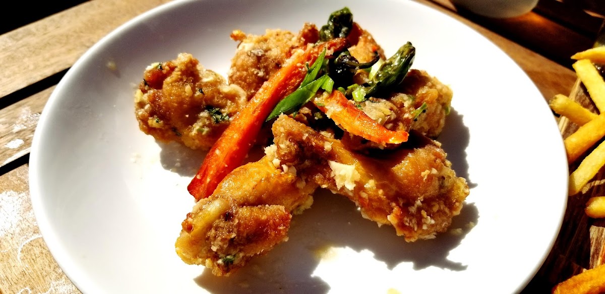 As you approach Park Chalet, the inviting outdoor seating area beckons, promising a unique dining atmosphere surrounded by lush greenery and the refreshing breezes from the nearby ocean. With a child and pet-friendly policy, this setting is perfect for enjoying a leisurely meal with loved ones, while your dog relaxes at your feet.